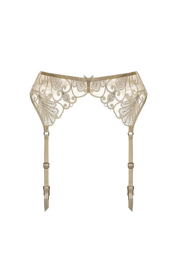 Зауженный пояс для завершения соблазнительного образа выполнен из дизайнеской вышивки, созданной по швейцарской технологии. Кружевная отделка по центру спины, регулируемые пажи для чулок.