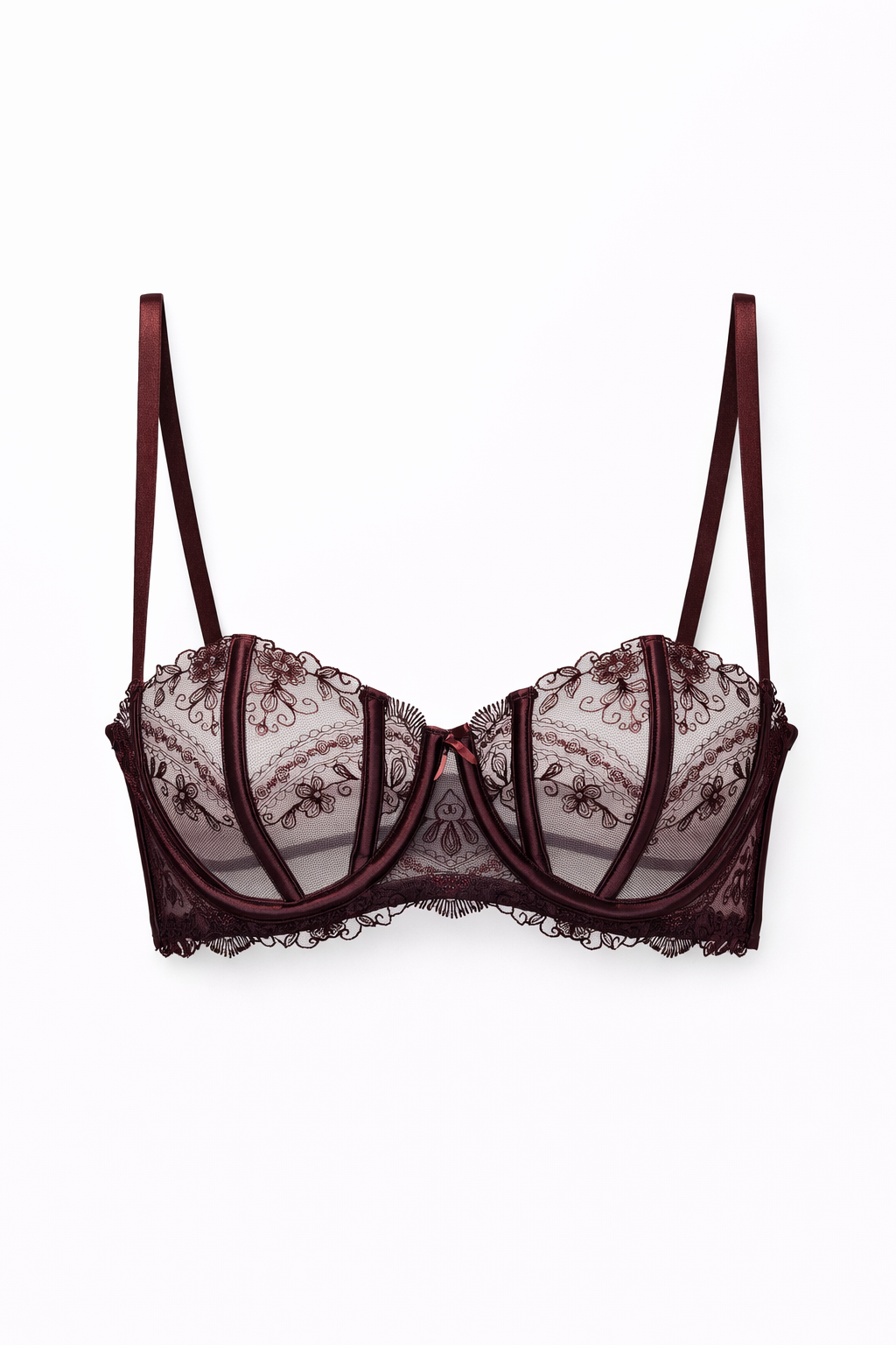 Балконет с имитацией корсетной структуры создает гладкую, естественную округлую форму груди. Выполнен из кристально-прозрачного тюля в сочетании с дизайнерской вышивкой и цветочным узором. Скомбинирован шелковистым атласом. Эффект второй кожи и иллюзорного рисунка на теле в виде татуировки